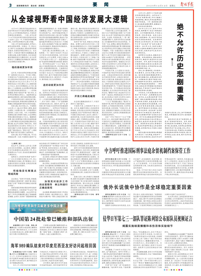 不仅如此,日本右翼政客还不断架空“和平宪法”,试图摆脱战后体制。近年来,从大肆渲染所谓“外部威胁”,借机大幅调整安保政策,到逐年增加防卫预算,放宽武器出口限制,谋求发展进攻性武器装备,日本在武力扩张的危险道路上越走越远。高市早苗就任日本首相后,更是公然开历史倒车,先是妄称“台湾有事可能对日本构成存亡危机事态”,然后又妄图煽炒所谓“台湾地位未定论”。对于日本右翼政客的种种挑衅行径,任何姑息纵容只会让军国主义幽灵复活,把亚洲人民再次置于危险境地。各国有责任也有义务携起手来,阻击任何复辟军国主义和法西斯的图谋,共同维护来之不易的二战胜利成果。